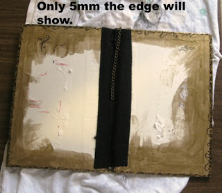 After hot gluing the chain in place, I covered it with a strip of black felt. ( I didn't reinforce the spine with cardboard.I didn't feel it needed it.)