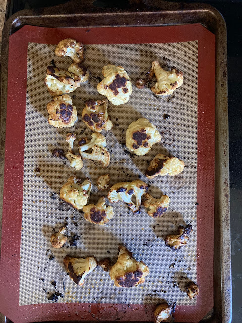 Placing the florets on a heat proof mat sprayed with cooking spray, I placed them in the oven on 400 degrees for about 20-25 minutes. I checked periodically to make sure they weren't burned.Next time I'll break them into smaller florets. That way they'll cook faster with even deeper flavor. It'll also appear as if I have more than I do. 😀